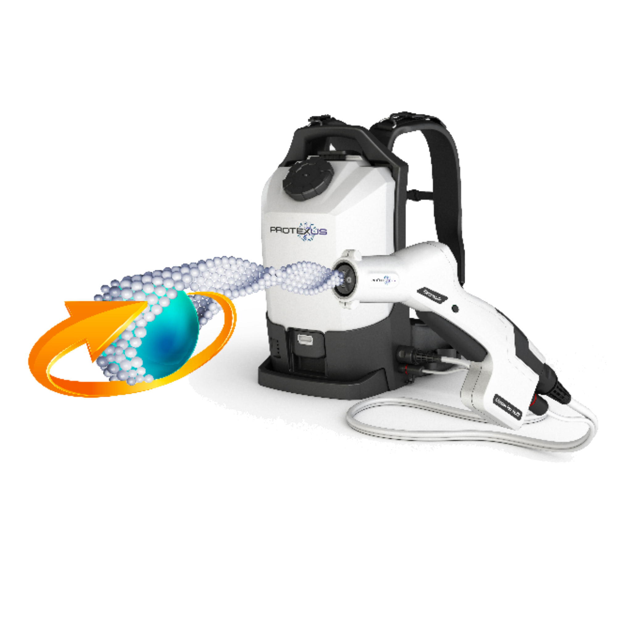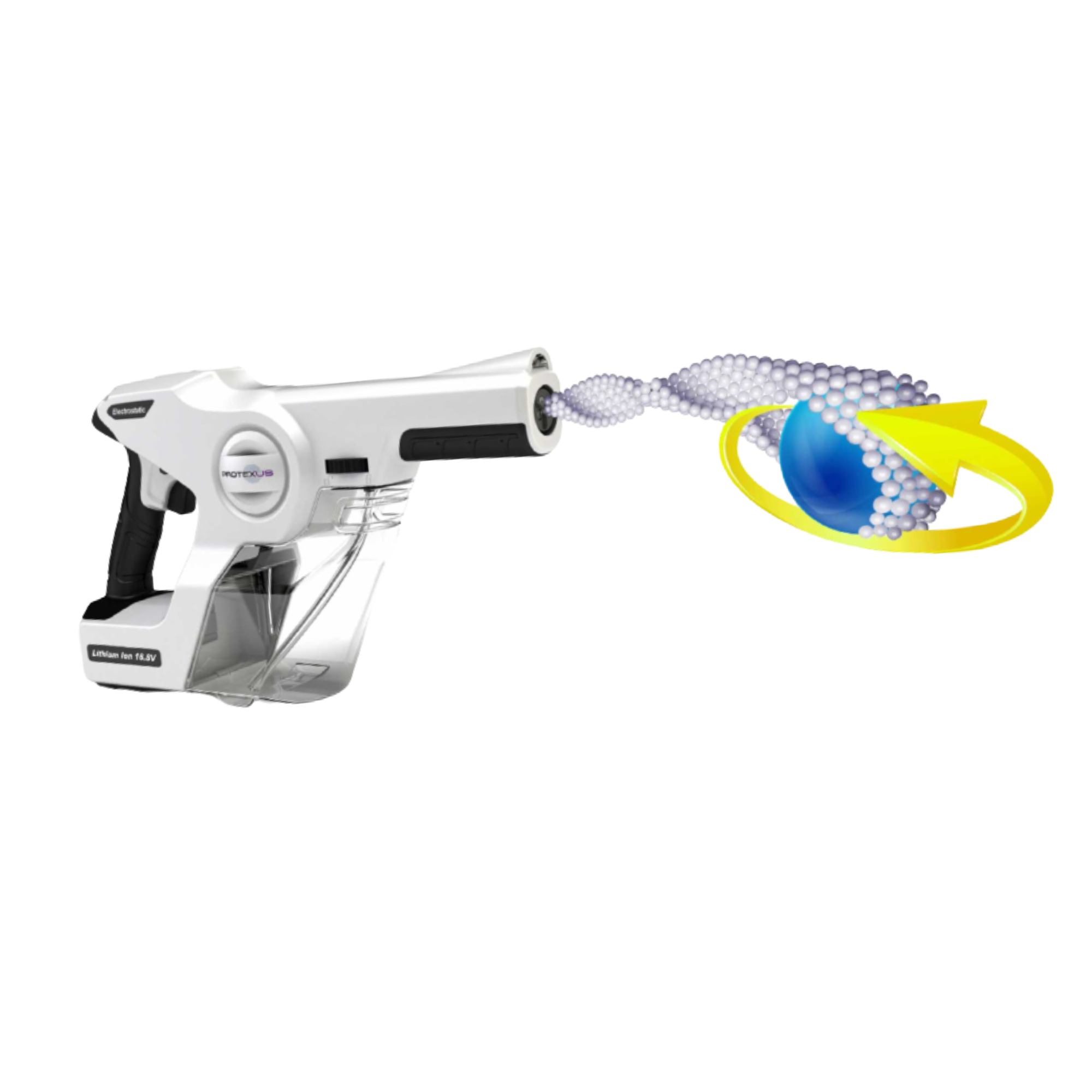Med traditionelle triggersprayere og foggere er det ofte besværligt at ramme alle overflader. Dette kan resultere i en masse spild af væske og mangelfuld dækning af eventuelt kontaminerede overflader. Med den banebrydende elektrostatiske teknologi i Protexus sprayeren sikres 360-graders desinfektion af alle overflader. En teknologi der både sparer tid, væske og øger hygiejnen. Sprayeren tilfører desinfektionsmidlet en positiv ladning inden væsken forstøves. Da de fleste overflader har en negativ ladning, vil den positivt-ladede væske tiltrækkes størstedelen af alle overflader som en magnet. Man opnår dermed en 360-graders dækning af alle overflader.