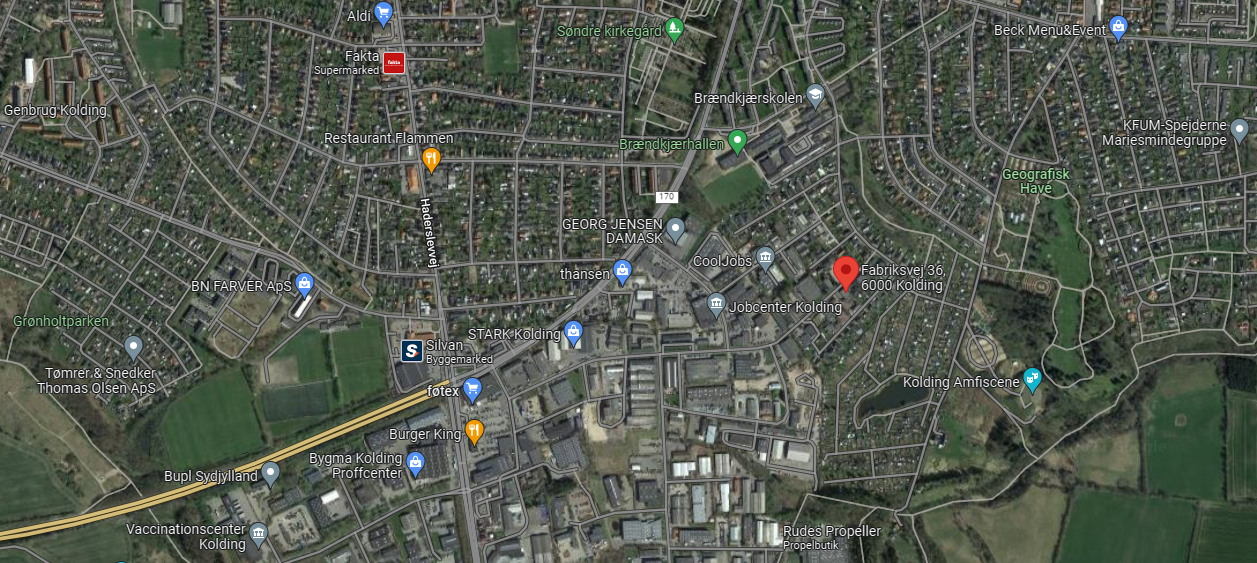 Vi har kontor på adresse: Fabriksvej 36, 6000 Kolding.