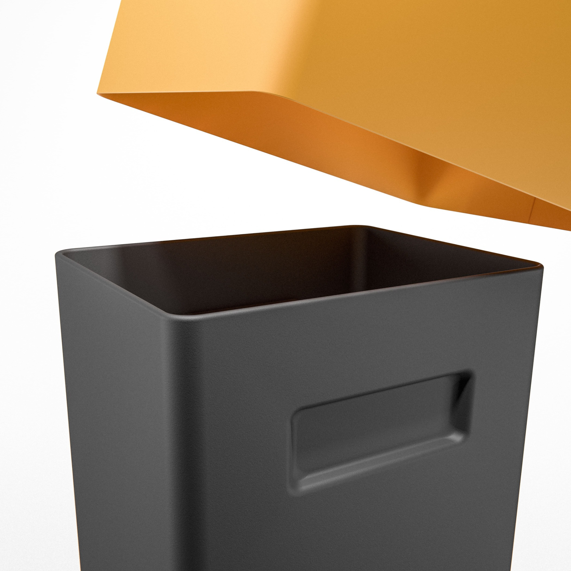 Coveret kan kombineres med to forskellige løsninger, alt efter behov: en indvendig plastikspand eller et metalkabinet med integreret poseholder. Begge dele købes separat, så systemet kan skræddersys til både mindre rum og områder med høj trafik.