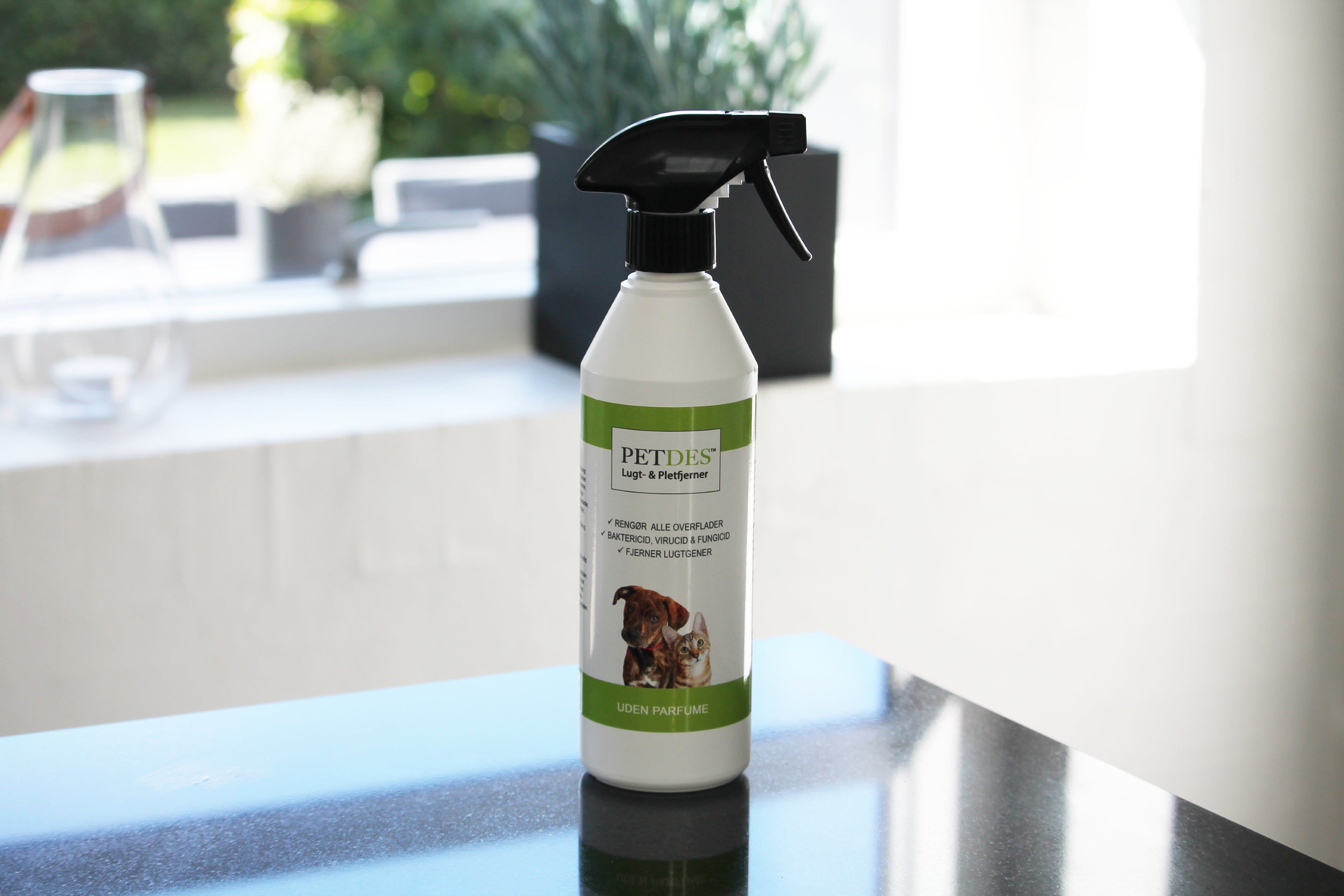 PETDES fjerner effektivt pletter og lugtgener efter ekstrementer, opkast og urin samt forebygger nye markeringer. PETDES indeholder kun naturlige ingredienser og har en bactericid, virucid og fungicid effekt. Efter brug efterlades intet farligt restprodukt, og dyret kan komme i transportkassen, kurven, buret mv. igen.