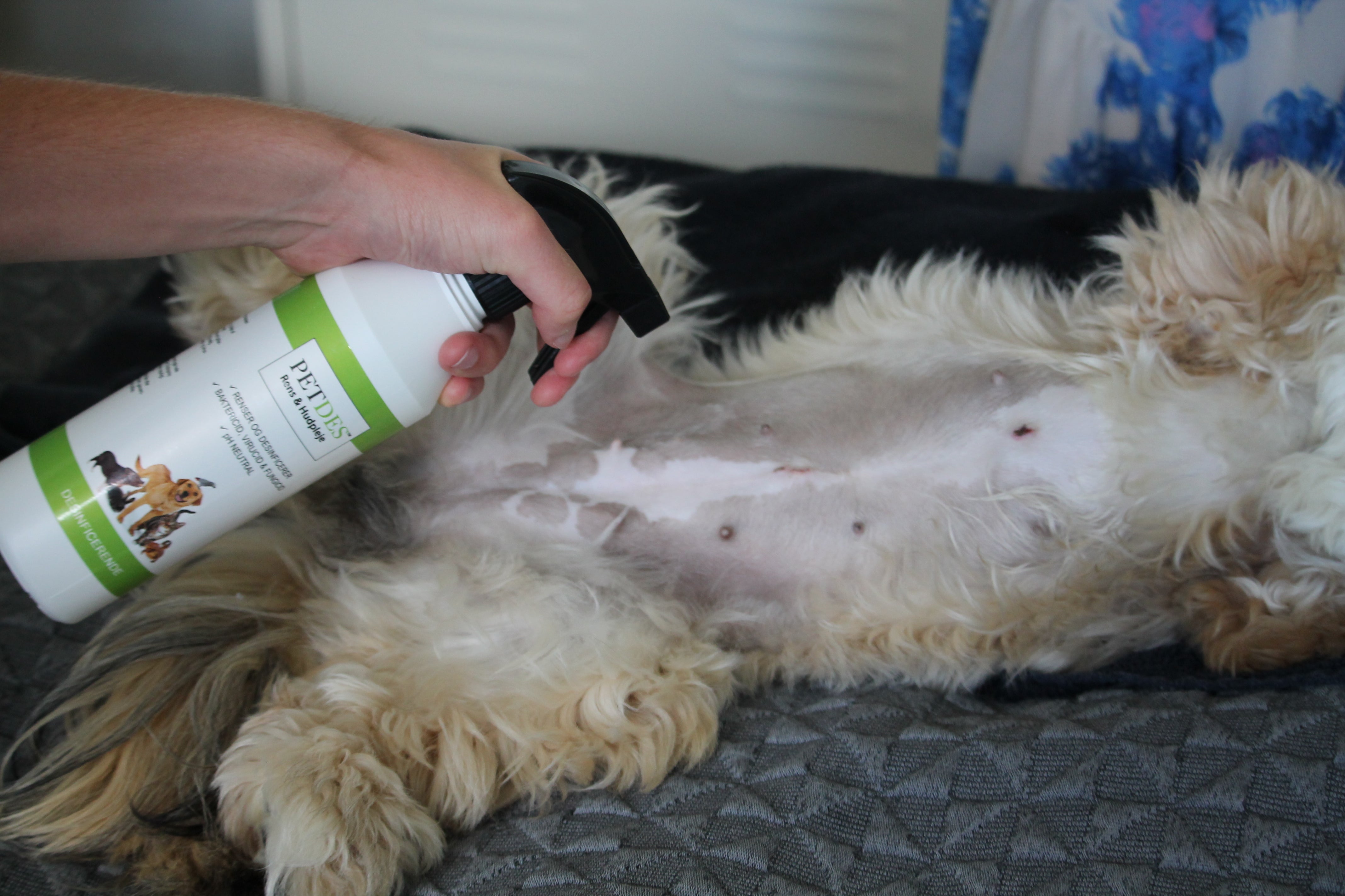 Skyl/spray godt med PETDES og lad det tørre, da det ikke skal skylles af efter brug.