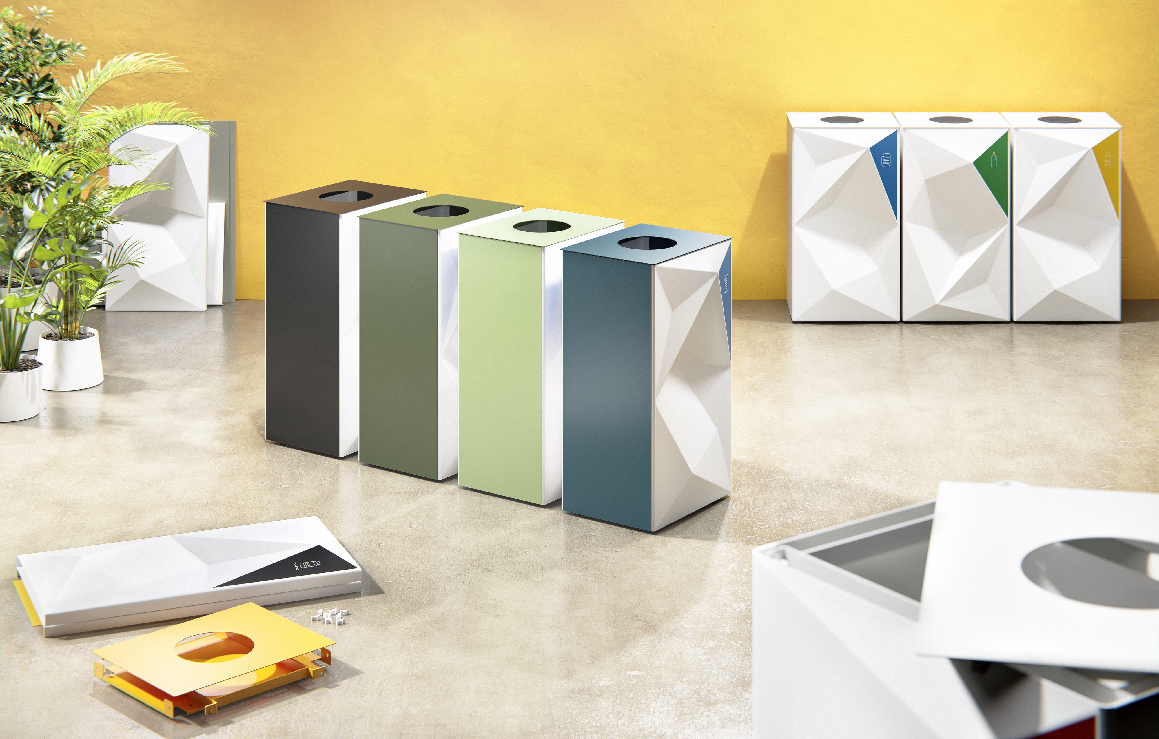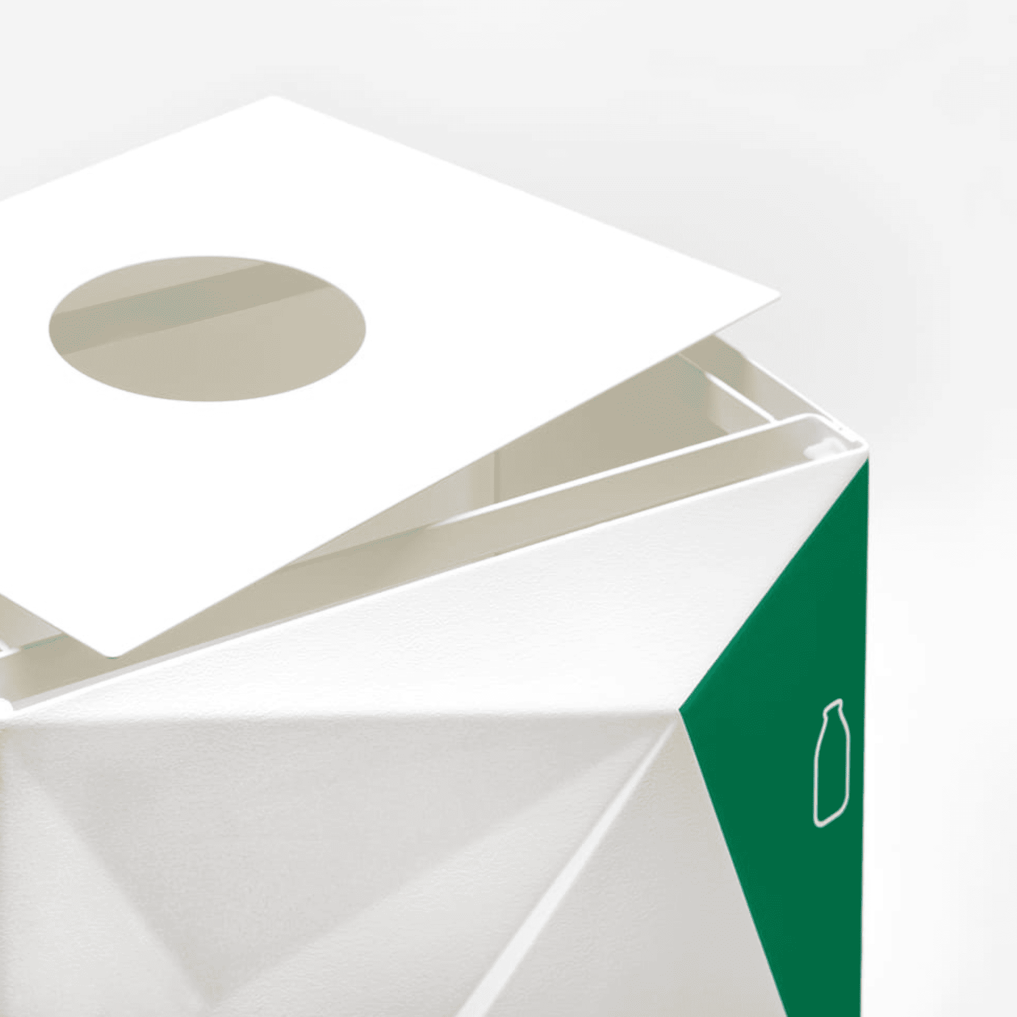 Beholderen er fremstillet i 1,2 mm stålplade med front- og bagsider i 3 mm slagfast termoplast (polystyren), hvilket giver en flot kontrast mellem materialerne. Den har et aftageligt låg, en indvendig ring i stål til at holde posen samt en base med gummifødder, som beskytter underlaget.