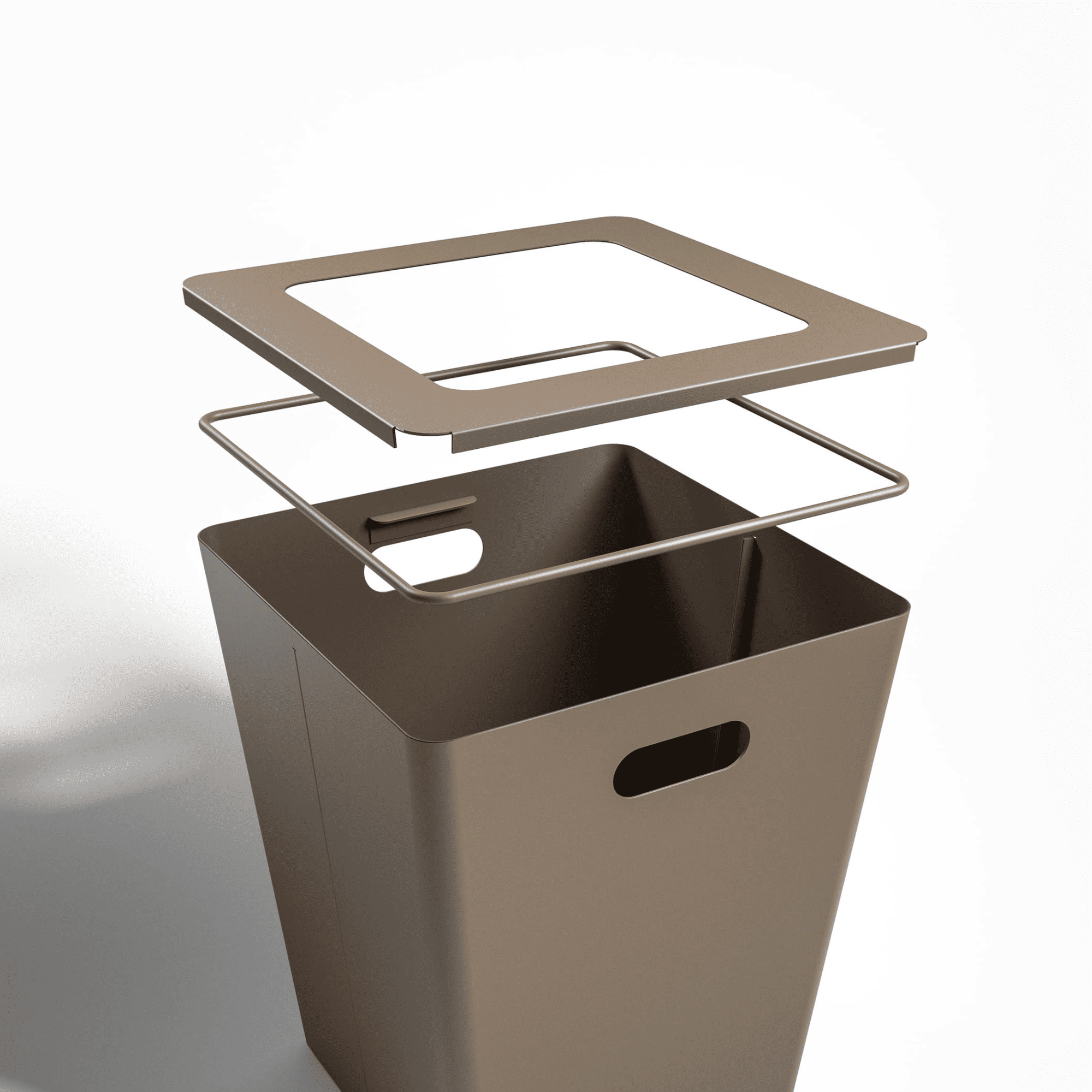 Winterthur er en stilren og kompakt affaldsbeholder, skabt til mindre kontormiljøer, mødelokaler, hotelværelser eller hjemmet. Den er perfekt til placering under et skrivebord eller diskret i et hjørne, hvor den bidrager til en ren og organiseret indretning.